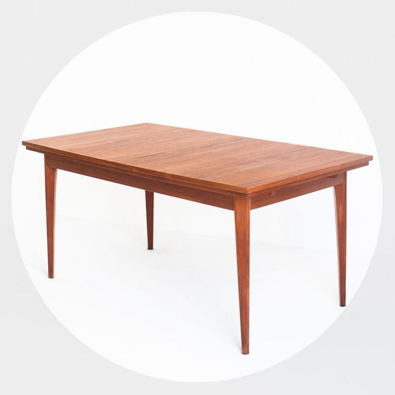 Taula d'estil escandinau amb dues extensions. Fusta de teca. França, anys 60.
