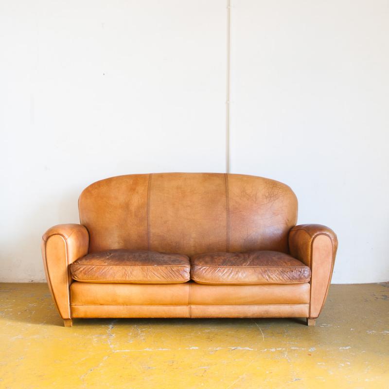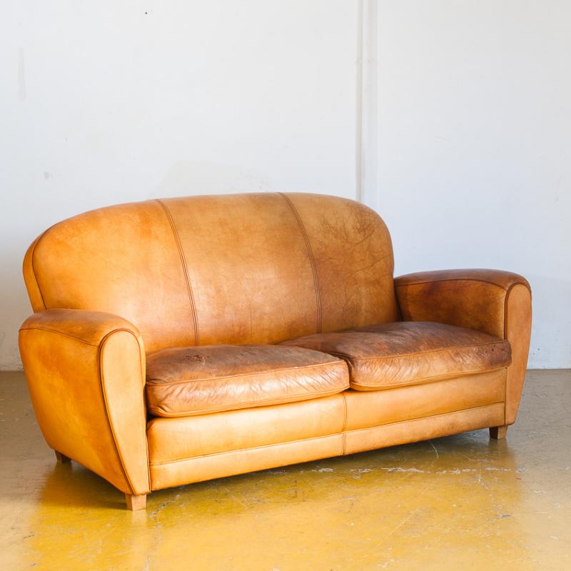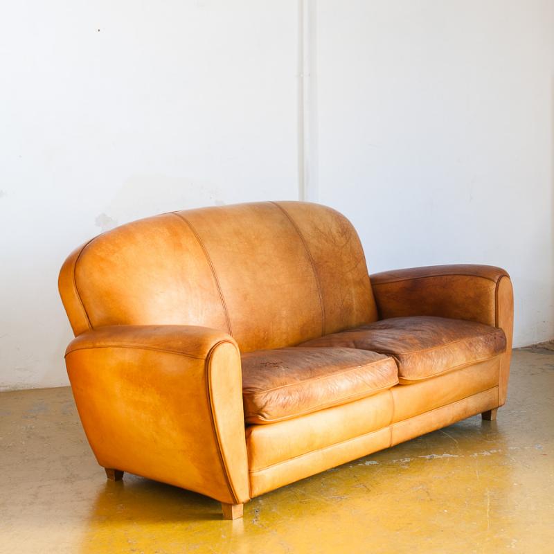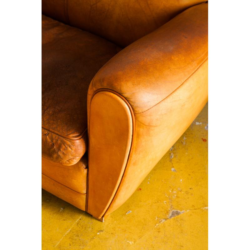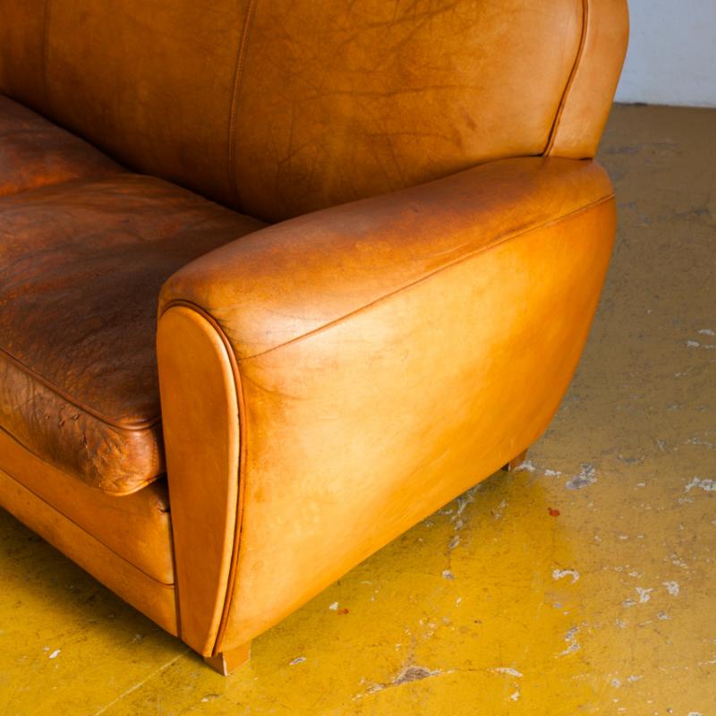 Sofá de cuero tipo "Club" color marrón con una estupenda pátina. Muy buen estado general a excepción de los asientos donde el uso es más acentuado. Ver fotos de detalle ya que forman parte de la descripción del artículo. Cualquier defecto a señalar se muestra en las mismas.