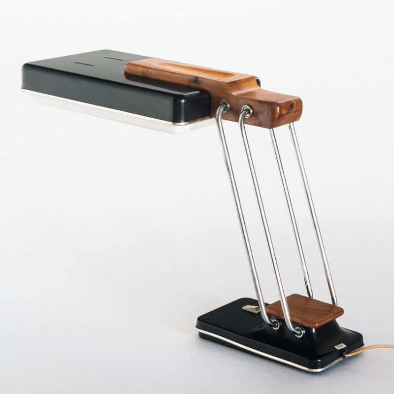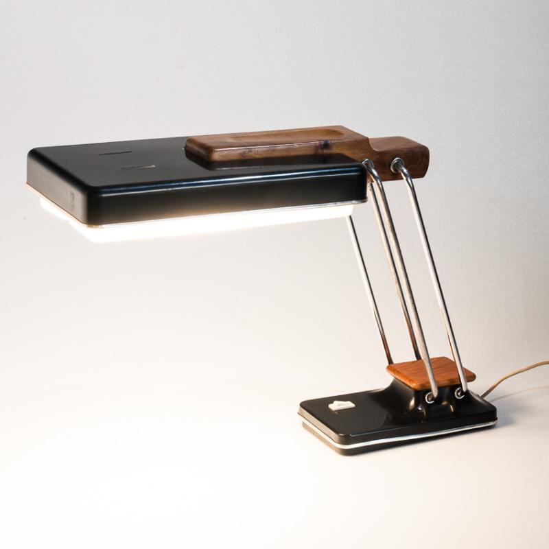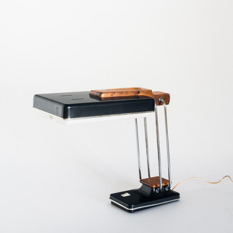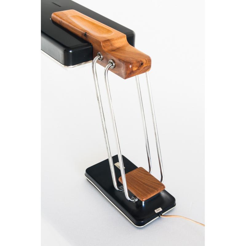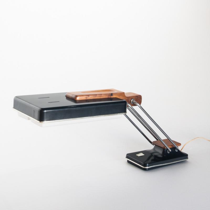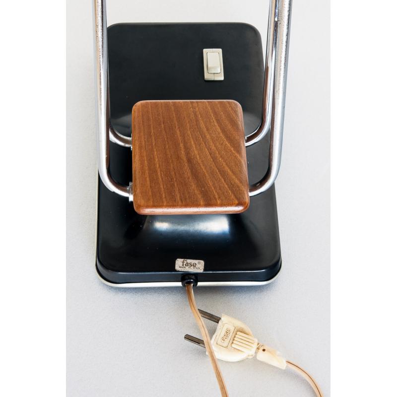 Lámpara de sobremesa. Editada por FASE (Madrid). Madera. Metal cromado y lacado. Orientable. España, años 60. Pieza de colección muy difícil de encontrar a la venta.