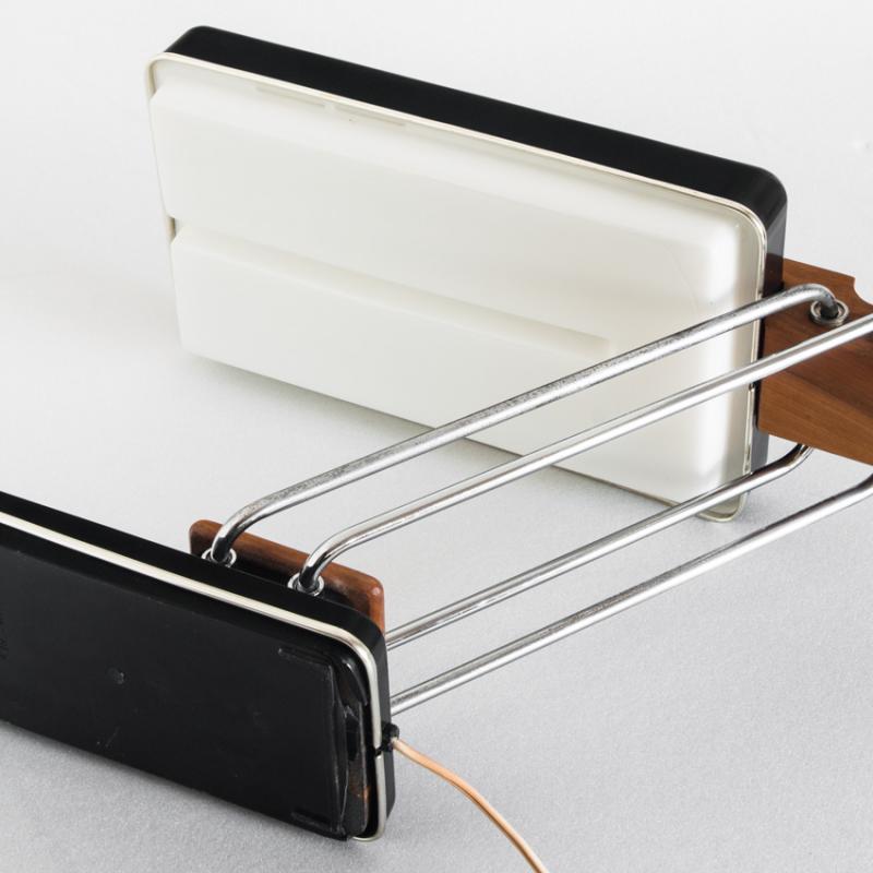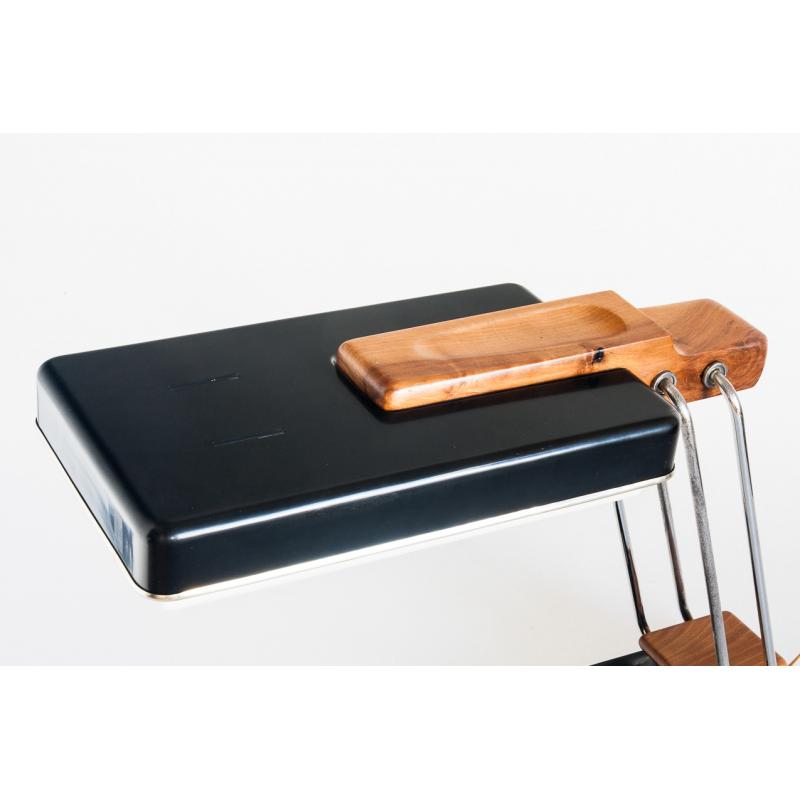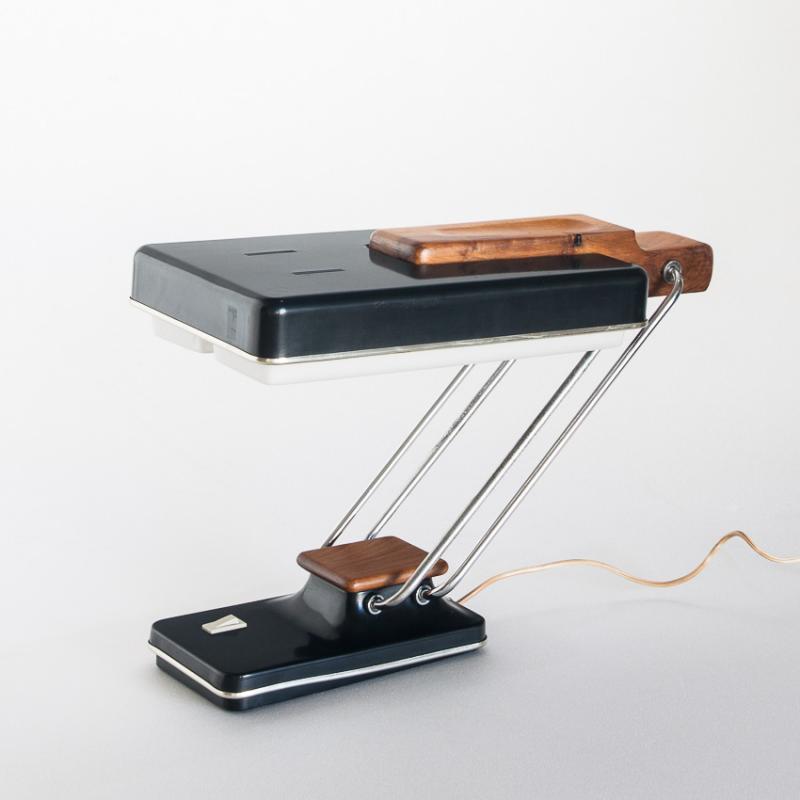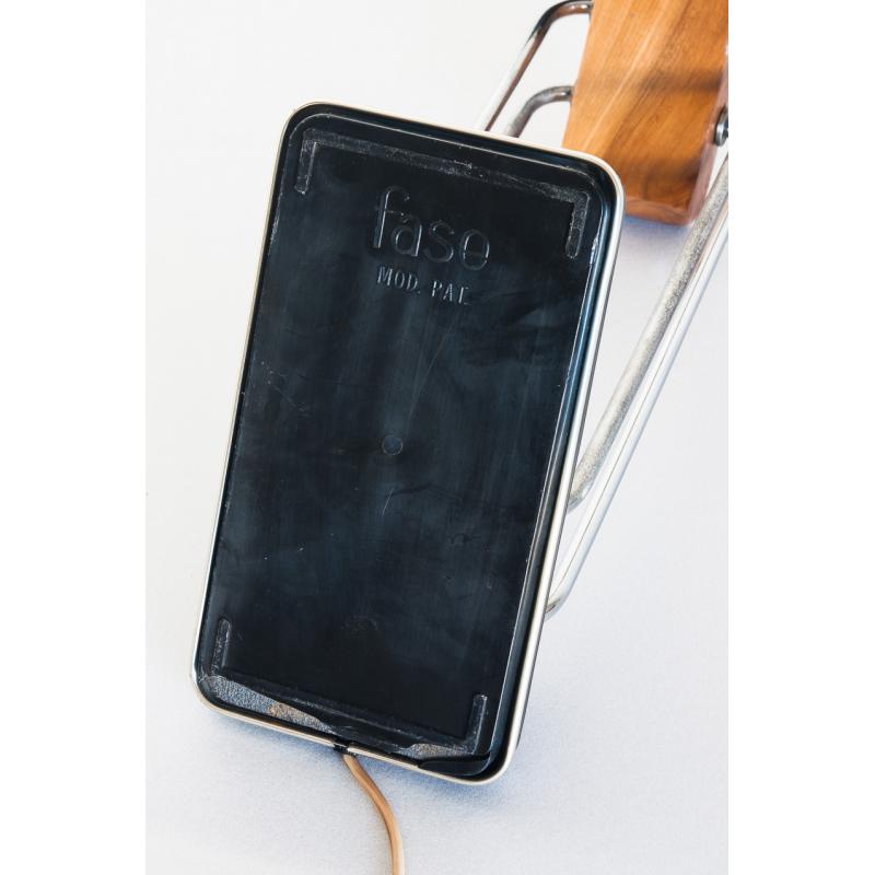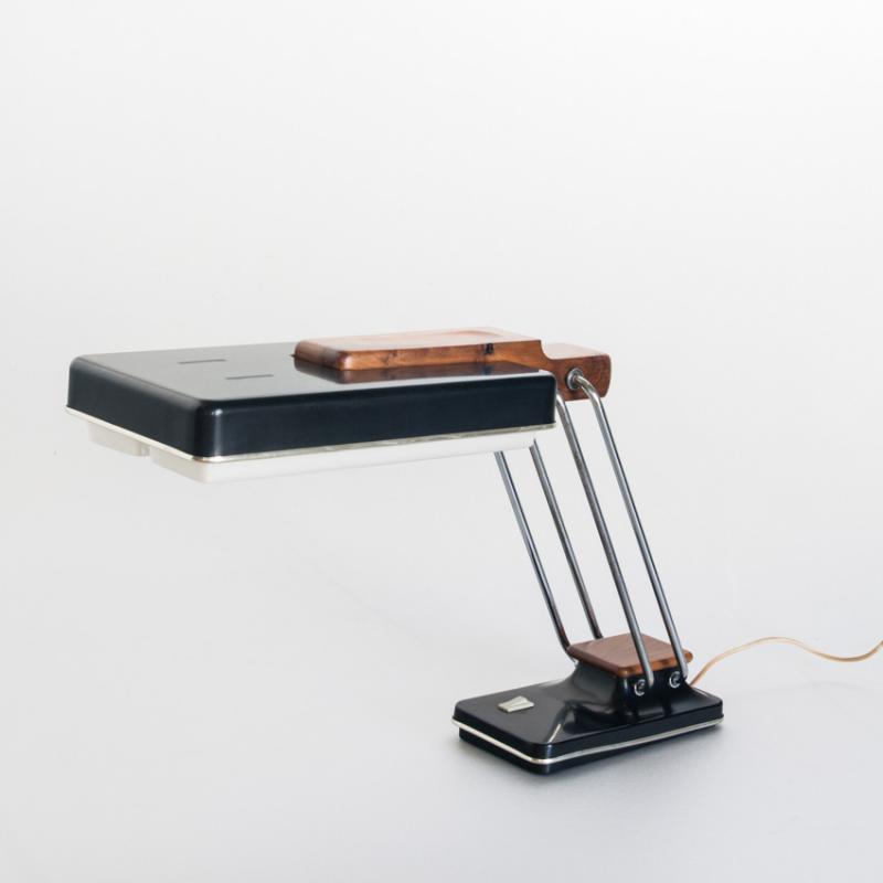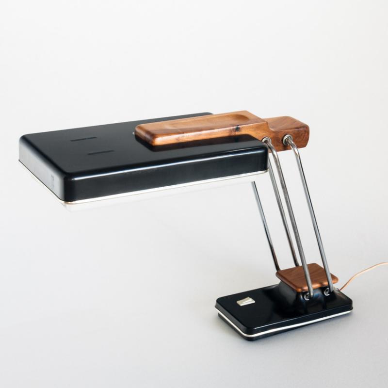 Lámpara de sobremesa. Editada por FASE (Madrid). Madera. Metal cromado y lacado. Orientable. España, años 60. Pieza de colección muy difícil de encontrar a la venta.