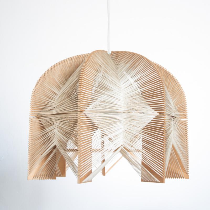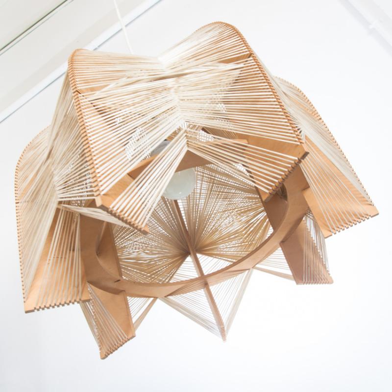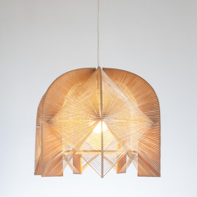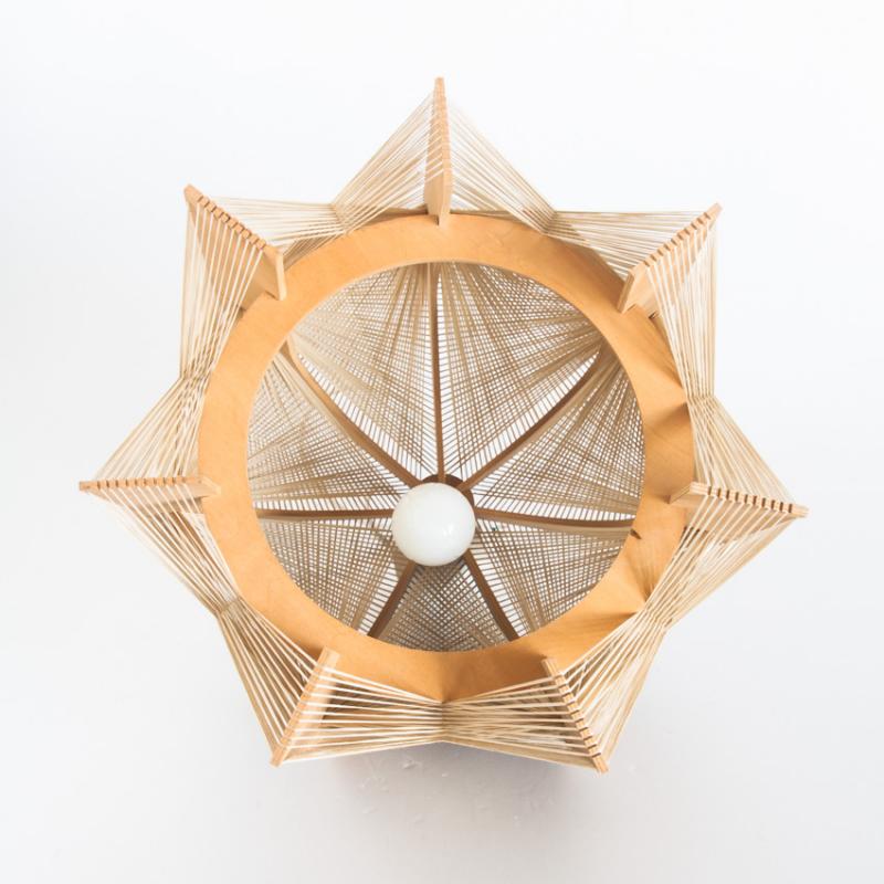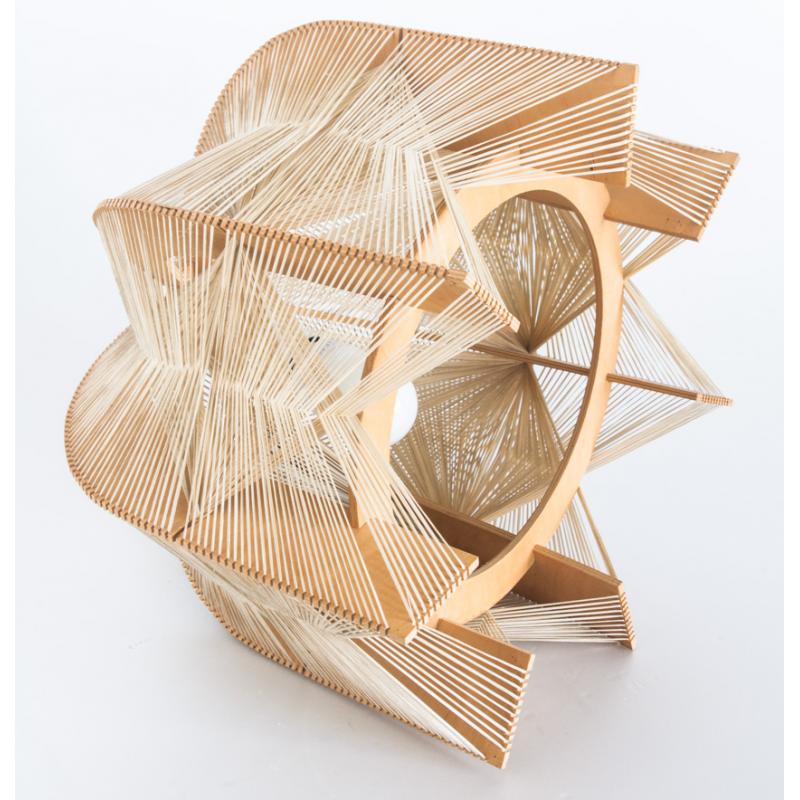 Lámpara de techo estilo nórdico de gran tamaño. Madera y fibras vegetales. Francia, años 60.