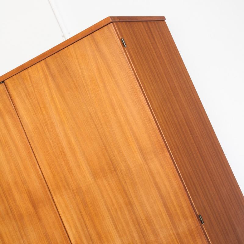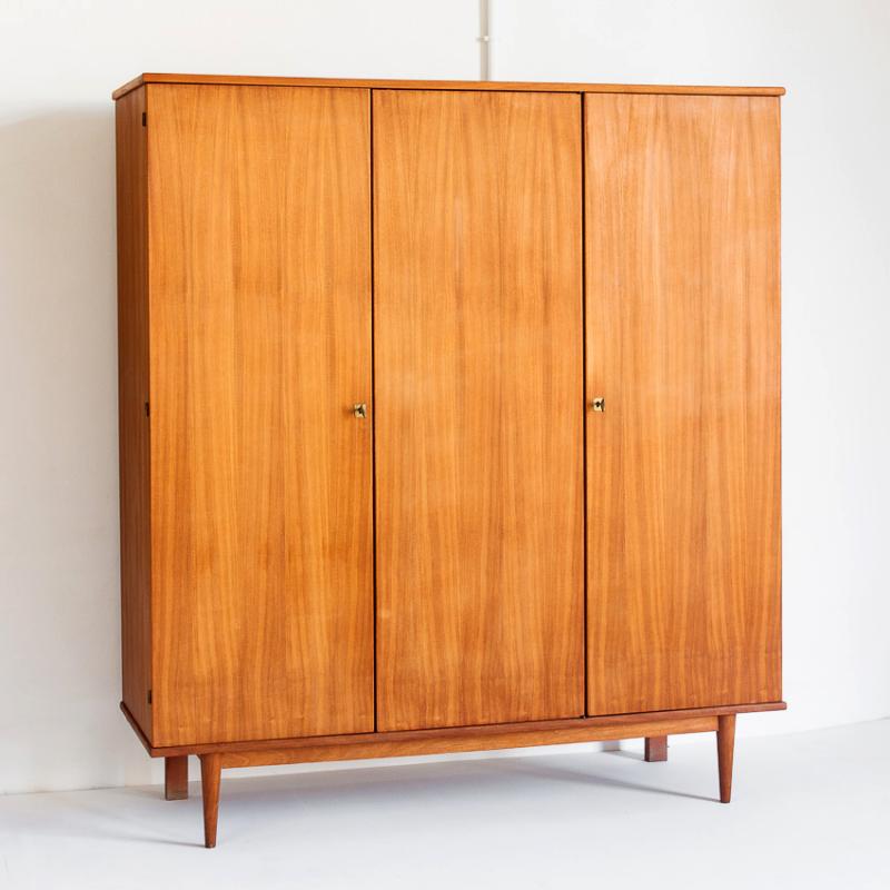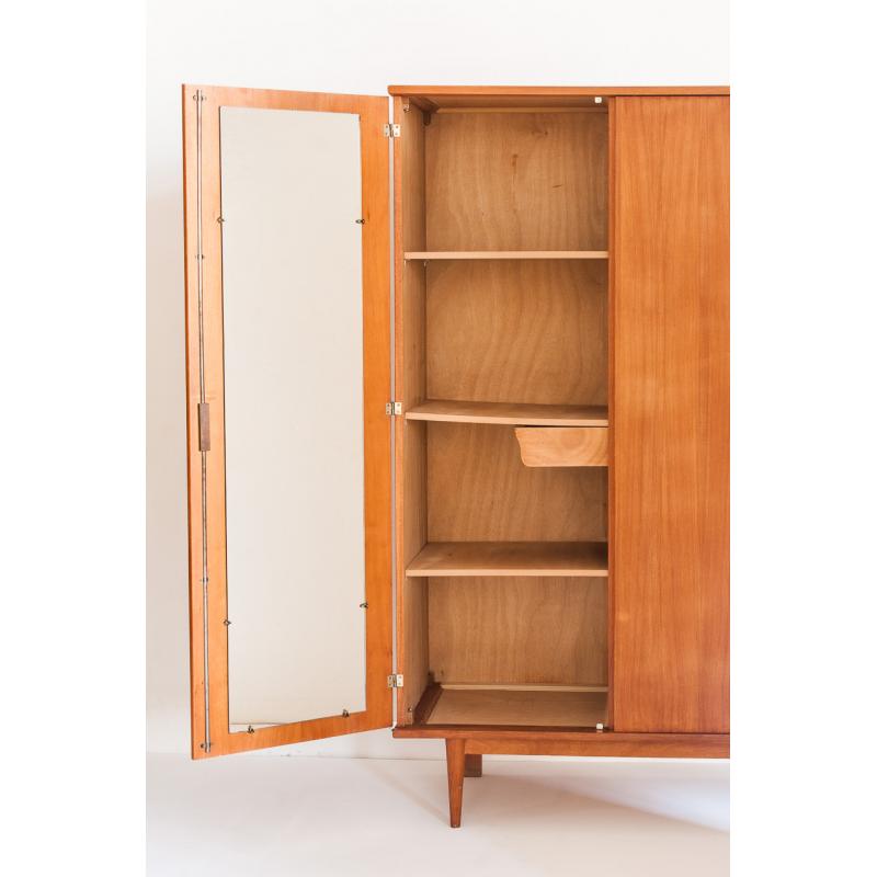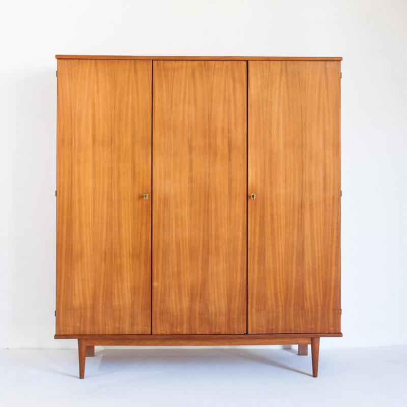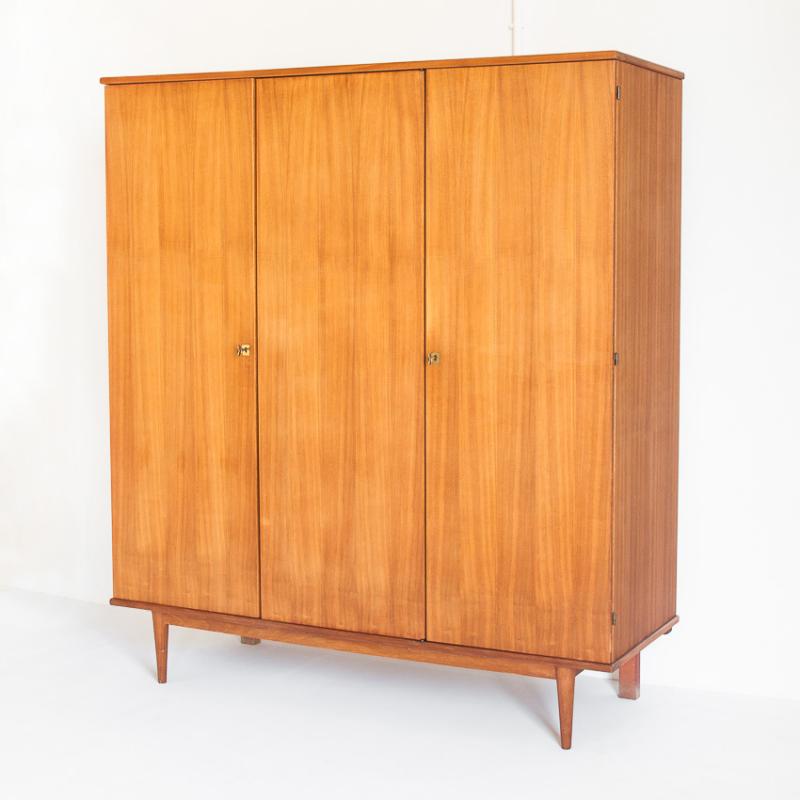 Armario ropero 3 puertas. Con espejo interior. Madera de teca. Francia, años 60. Interior para colgar ropa y con baldas y cajón.