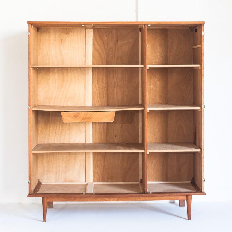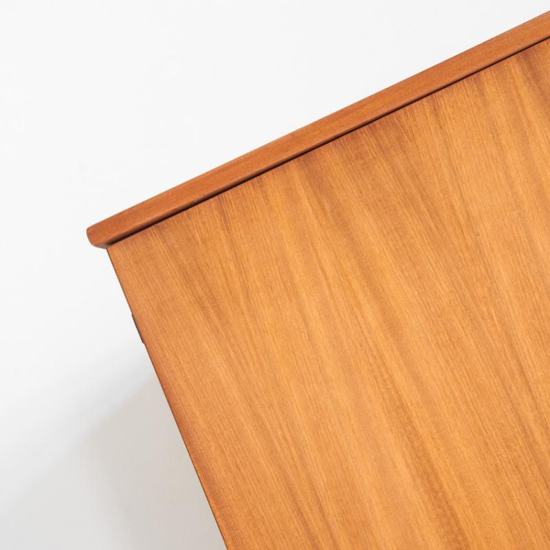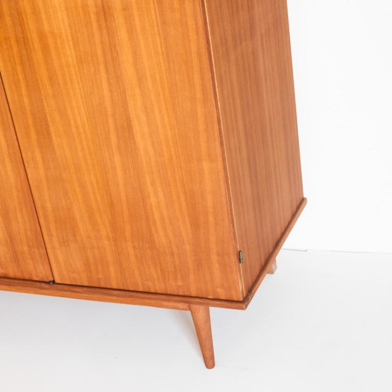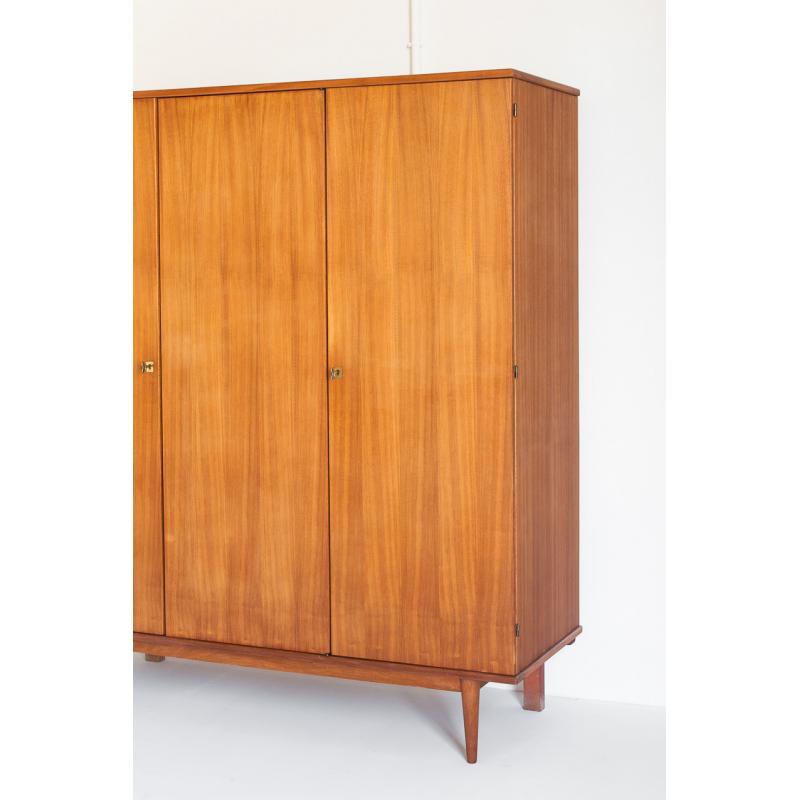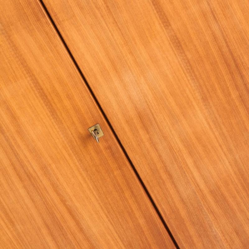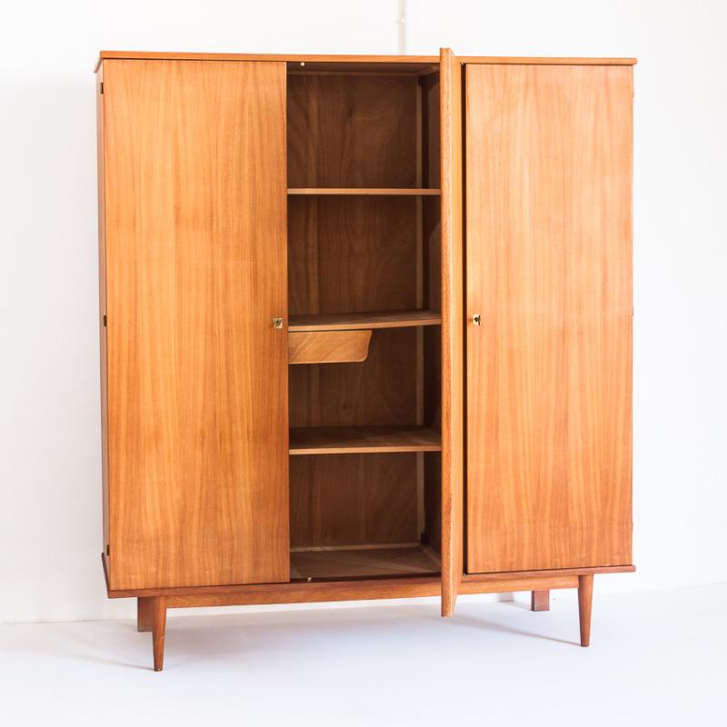 Armario ropero 3 puertas. Con espejo interior. Madera de teca. Francia, años 60. Interior para colgar ropa y con baldas y cajón.