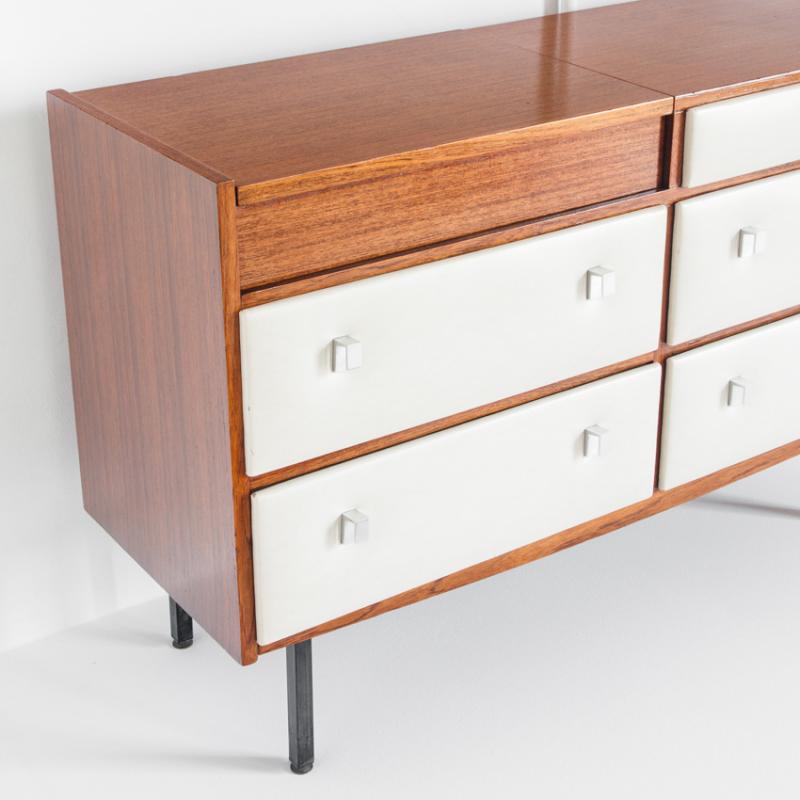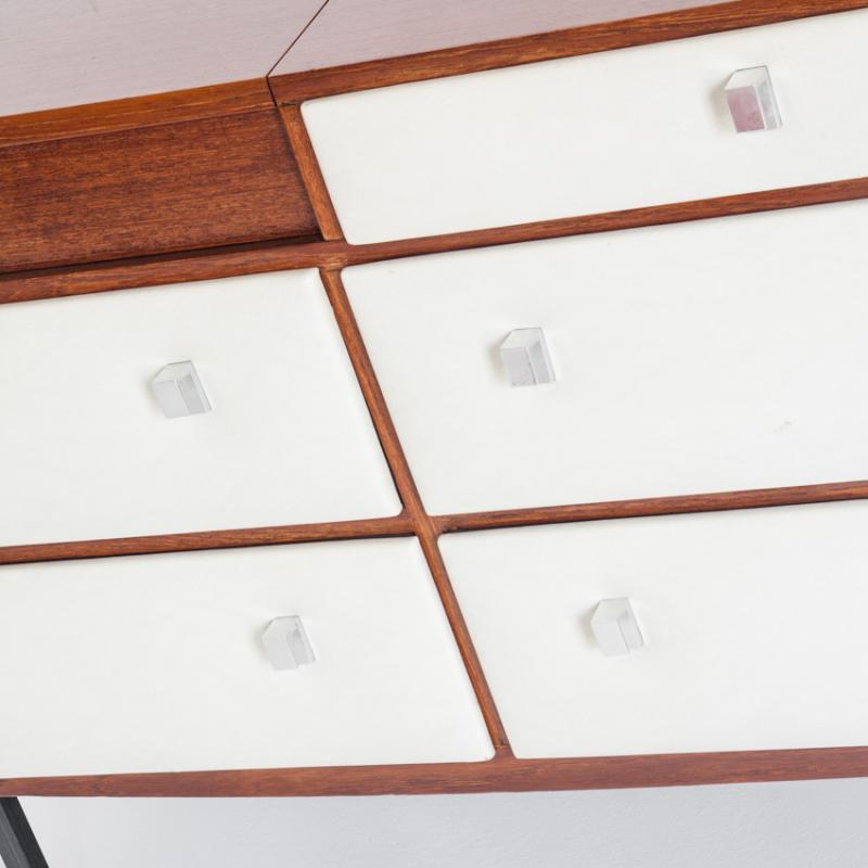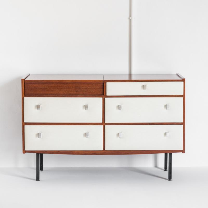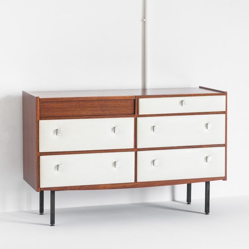 Cómoda de cinco cajones. Con tocador abatible. Madera de teca. Frontal de los cajones tapizado en polipiel. Francia, años 60.