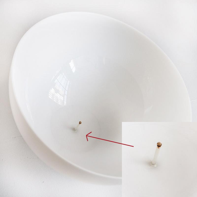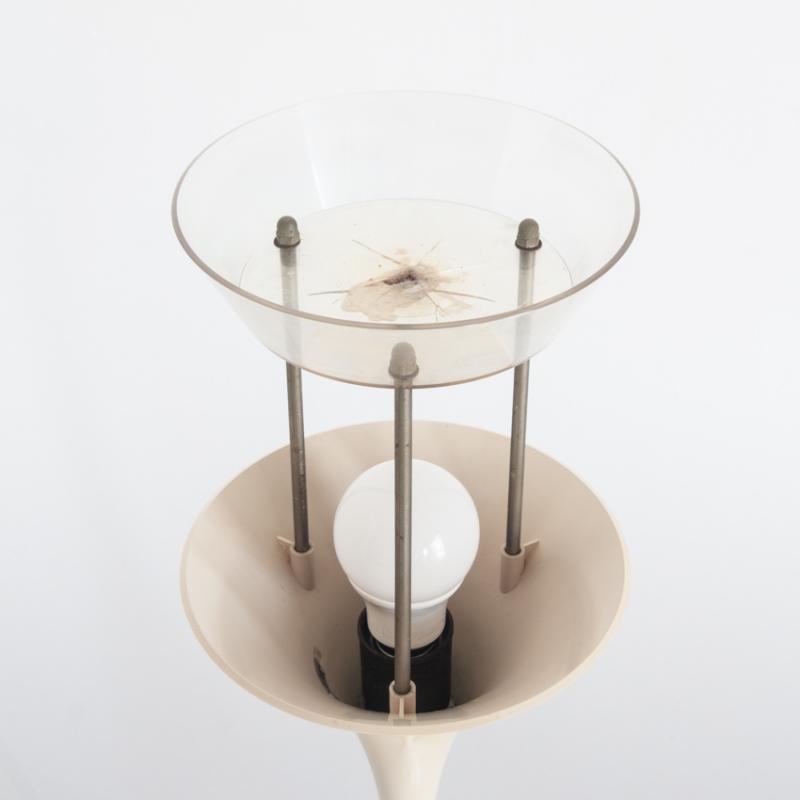 La sujección de la pantalla con la lámpara se ha desprendido (ver fotos de detalle) aunque ello no afecta a su funcionalidad ni se aprecia estéticamente. La pantalla se asienta sobre el mástil de la lámpara correctamente tal como fue diseñada y de forma estable. El interruptor de encendido de la base está fuera de servicio. Se ha añadido un interruptor de paso en el cable. El precio indicado tiene en cuenta estos defectos.
