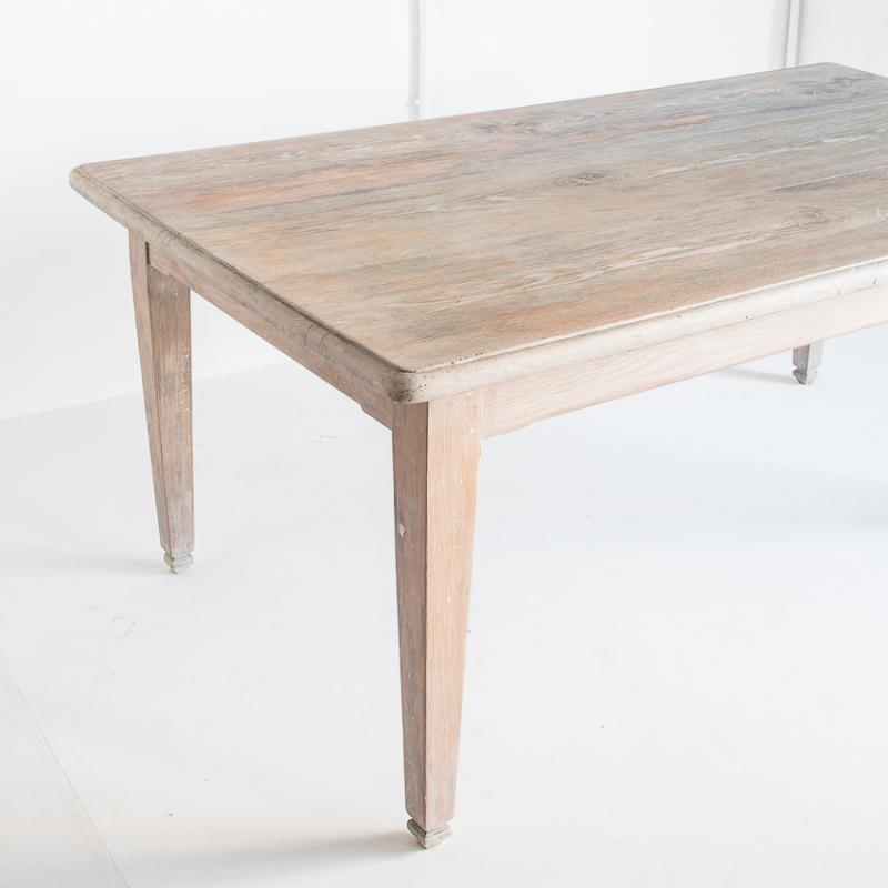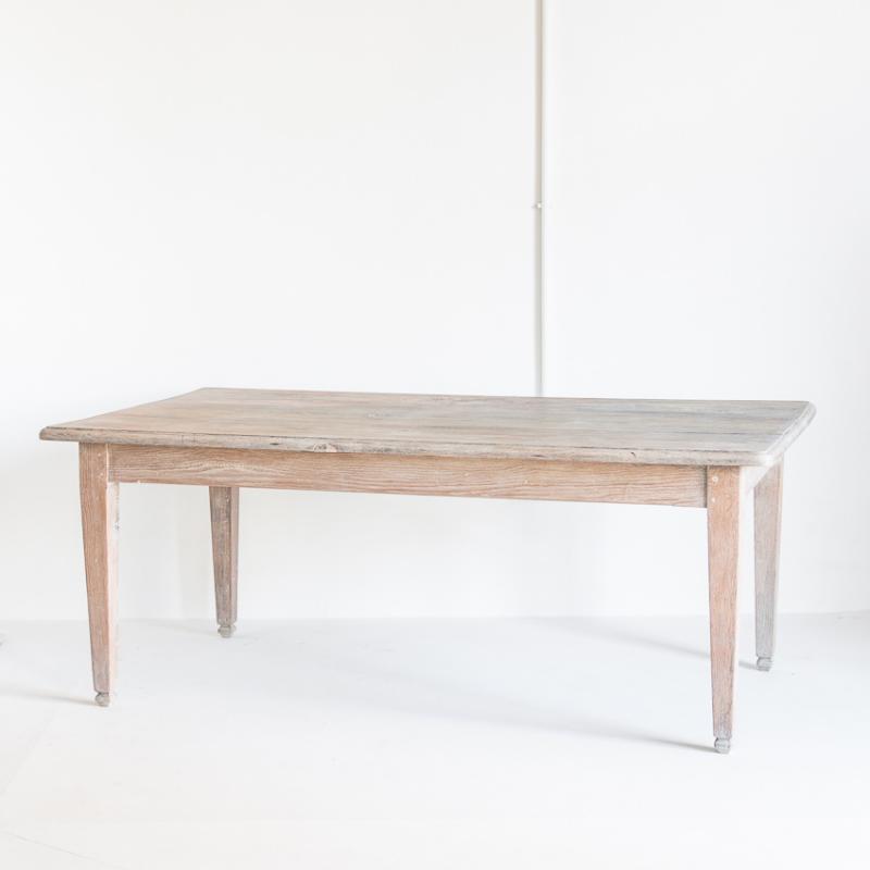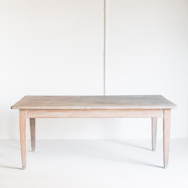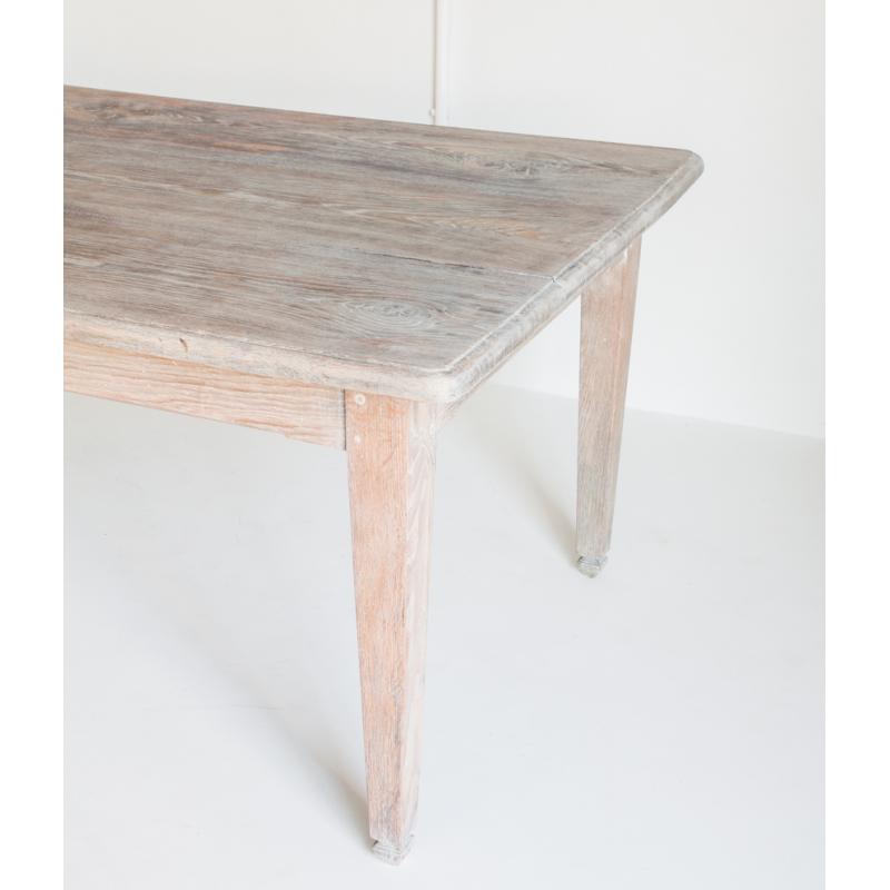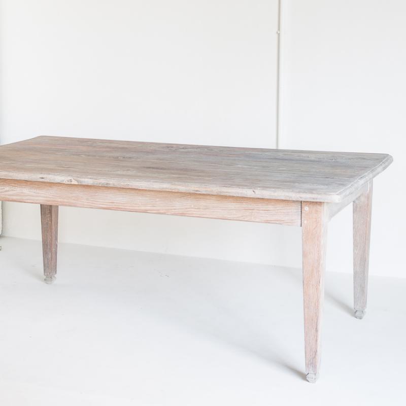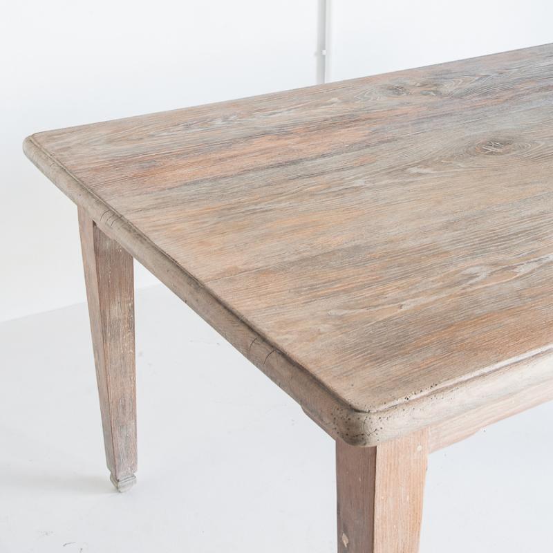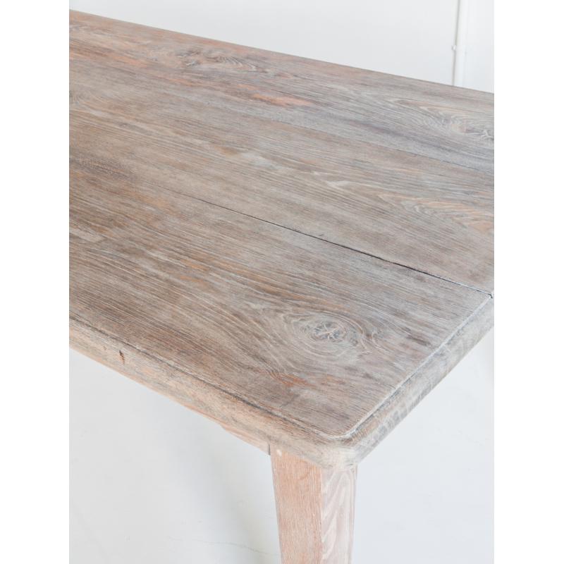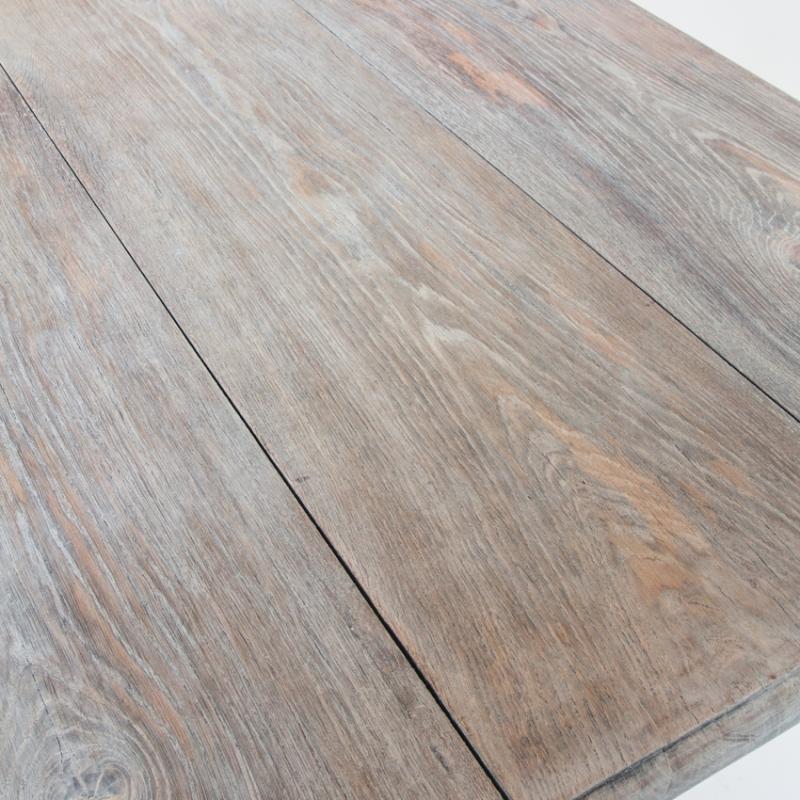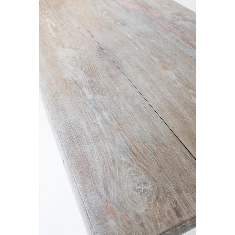 Mesa de roble macizo confeccionada a la antigua utilizando remaches de madera. Restaurada. Acabado con aceite protector Rubio Monocoat White para un efecto de madera lavada.
