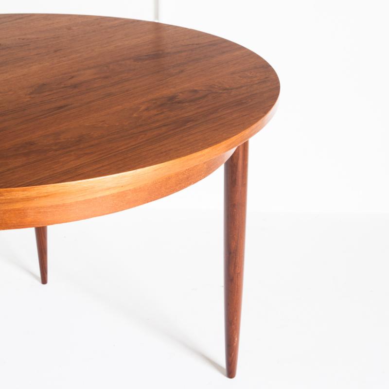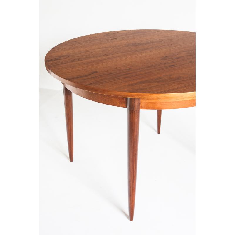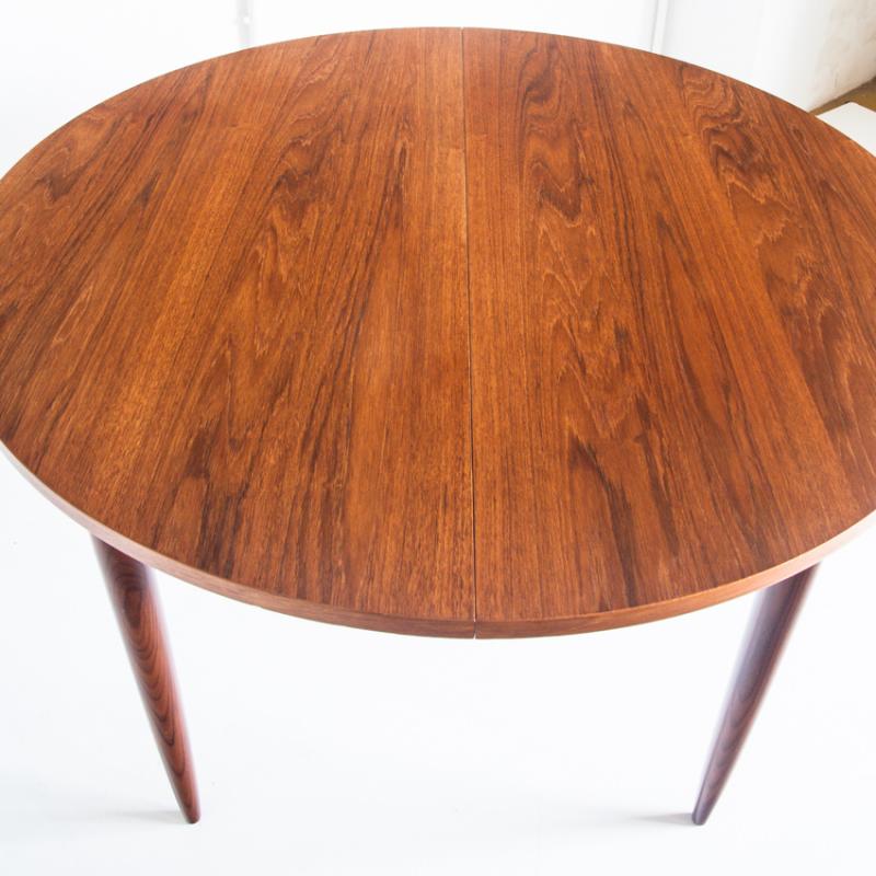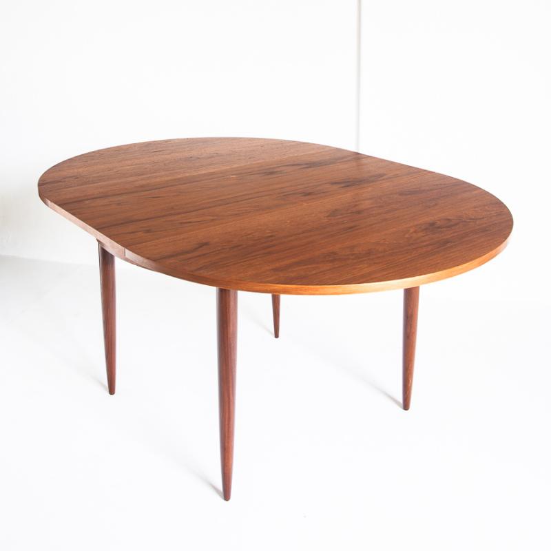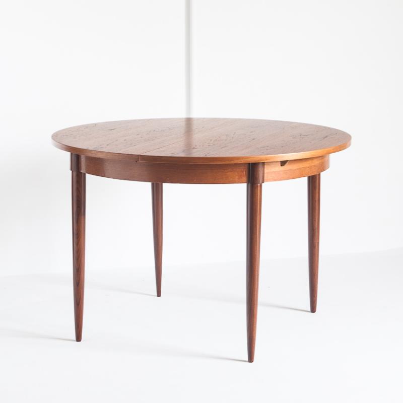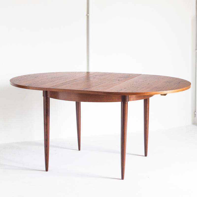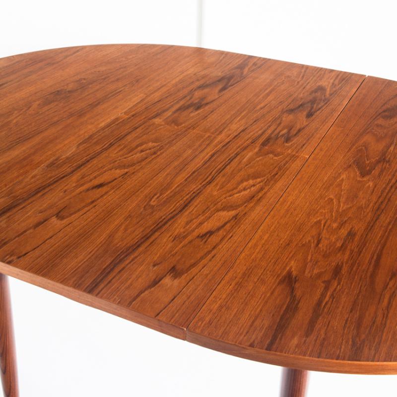 Mesa de comedor de estilo escandinavo. En madera de teca barnizada. Con una extensión. Francia, años 60.