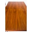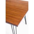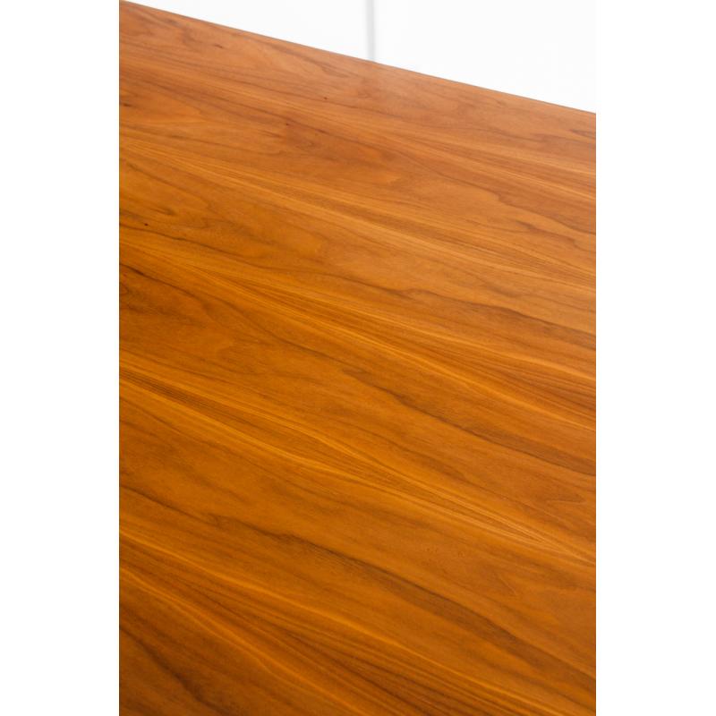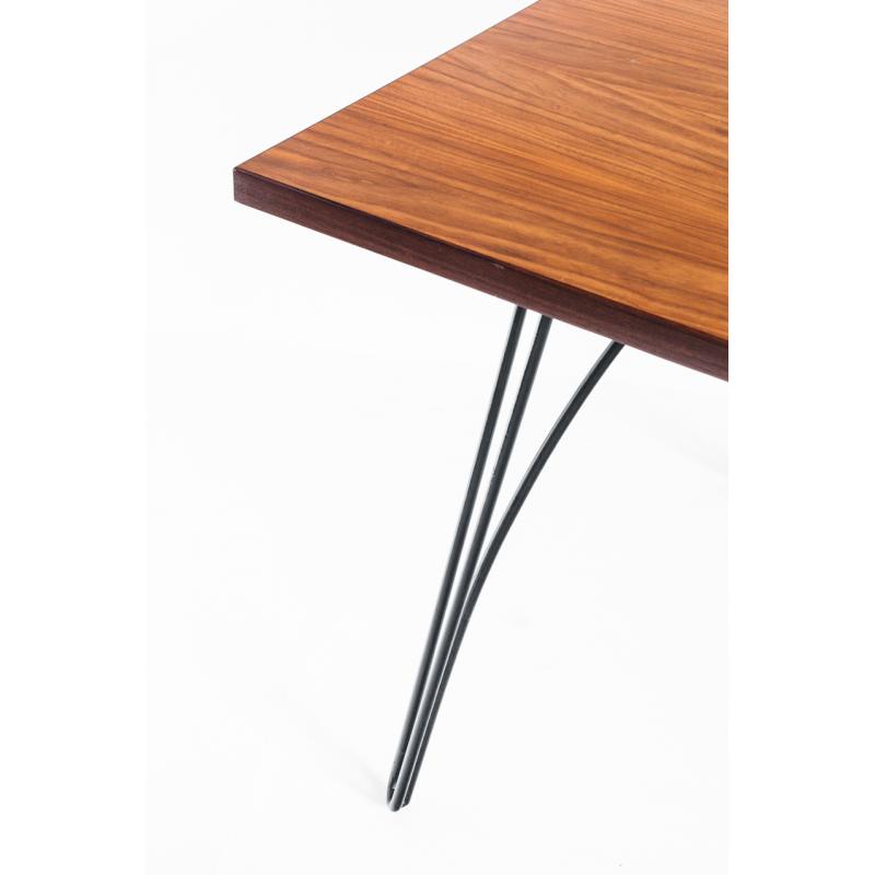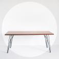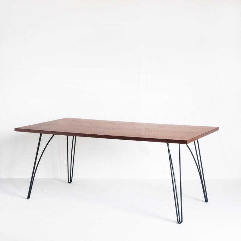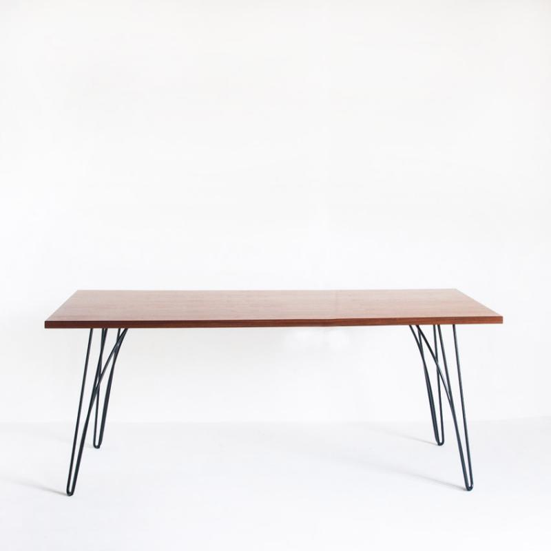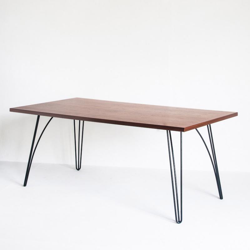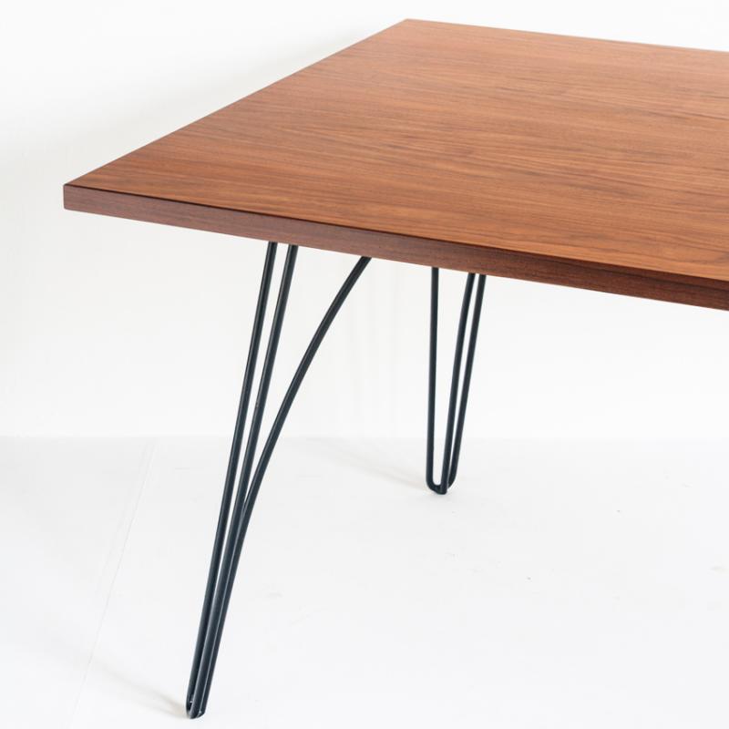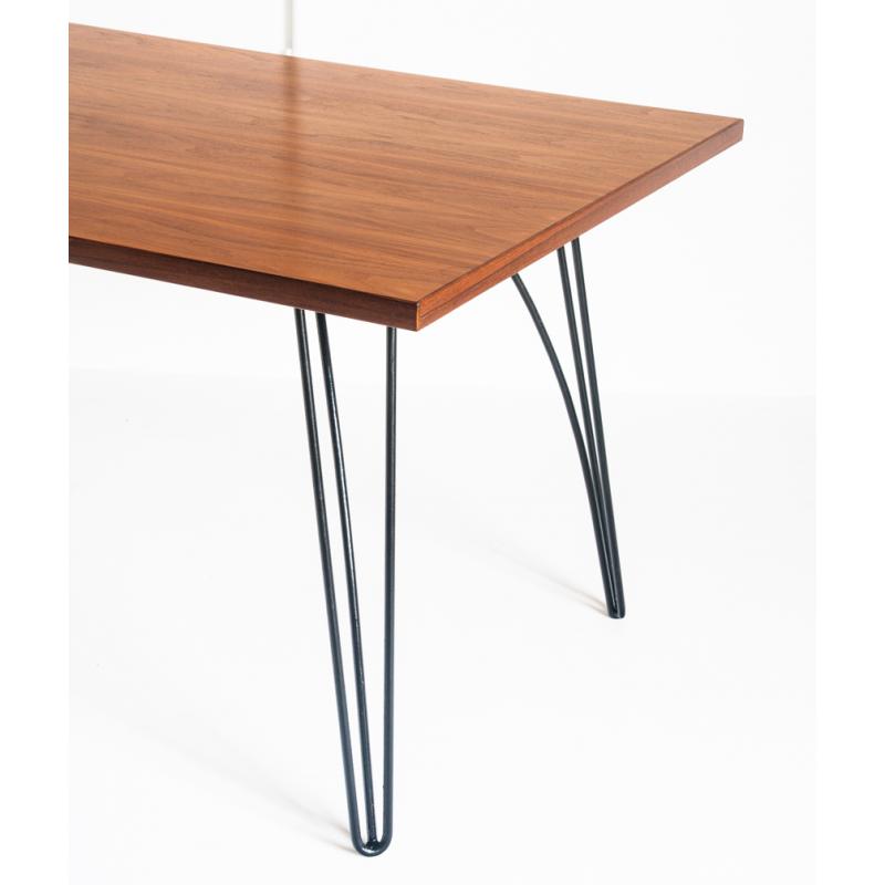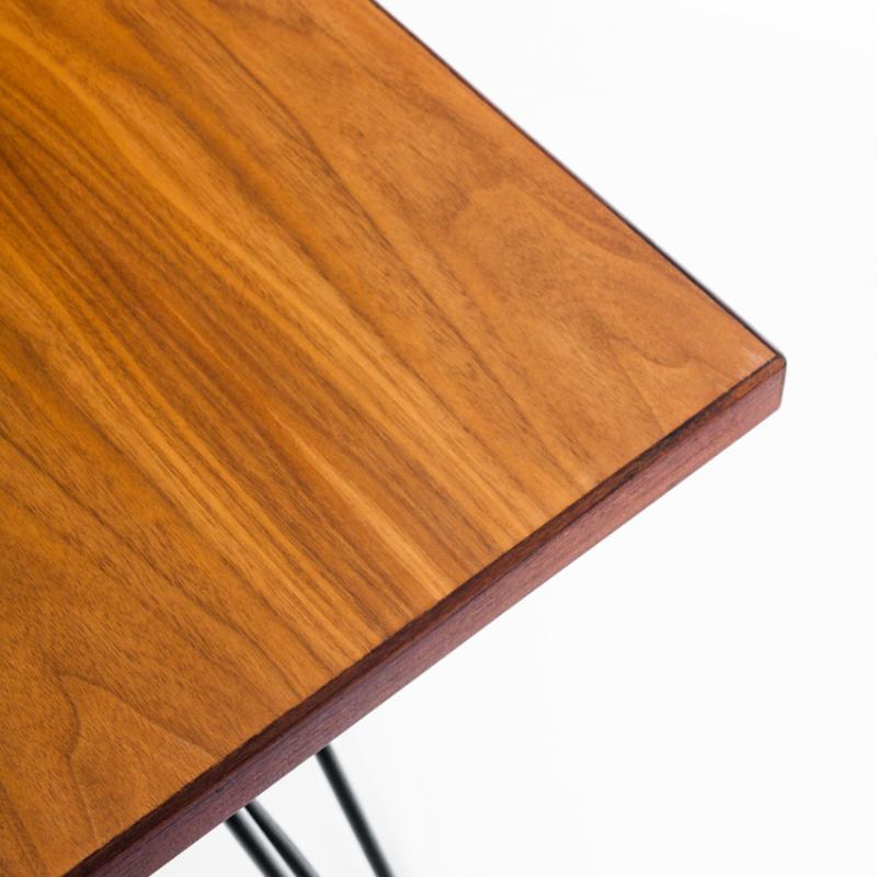 Mesa realizada con tablero de partículas de alta densidad de 3 cm de grosor. Chapado con madera de nogal y canto macizo de iroko. Patas de hierro recuperadas originales de los años 50..