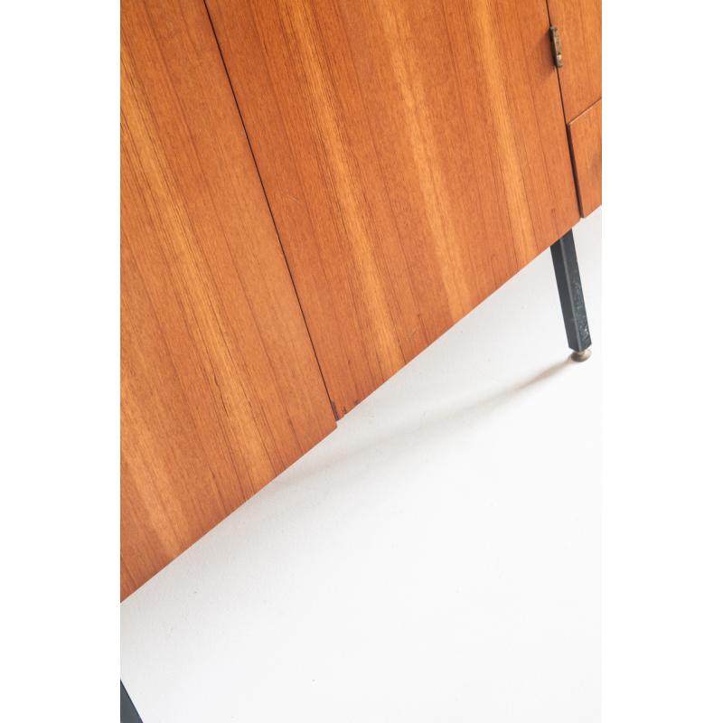 Referencias del diseño: En la línea de los trabajos de Pierre Guariche, Joseph Andre Motte y el grupo ARP (Atelier des Recherches Plastiques). La editora de muebles Minvielle realizó mobiliario de calidad muy similar a este diseño. Materiales: Madera de teca y pies de hierro regulables en la base.