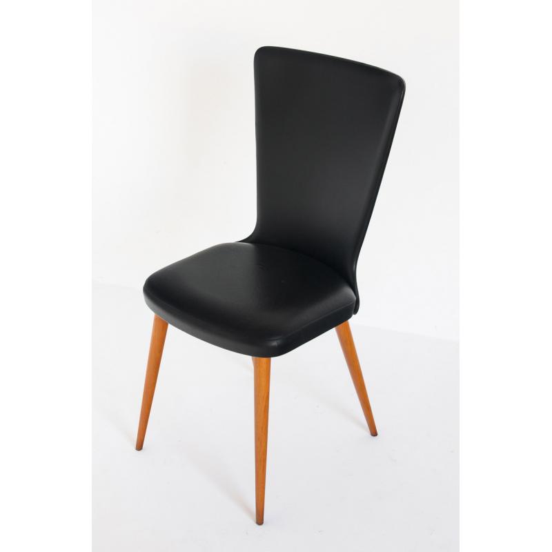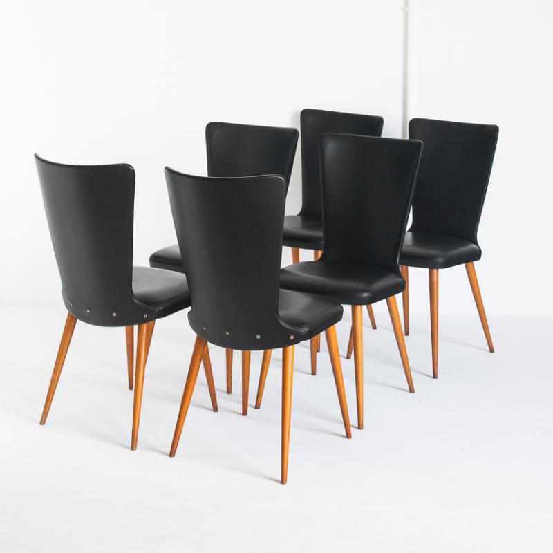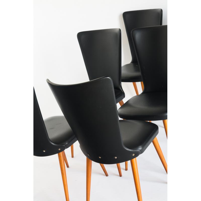 Conjunto de 6 sillas vintage. Madera de haya y eskai negro. Francia, años 60.