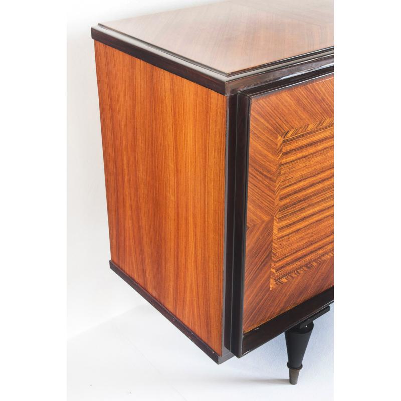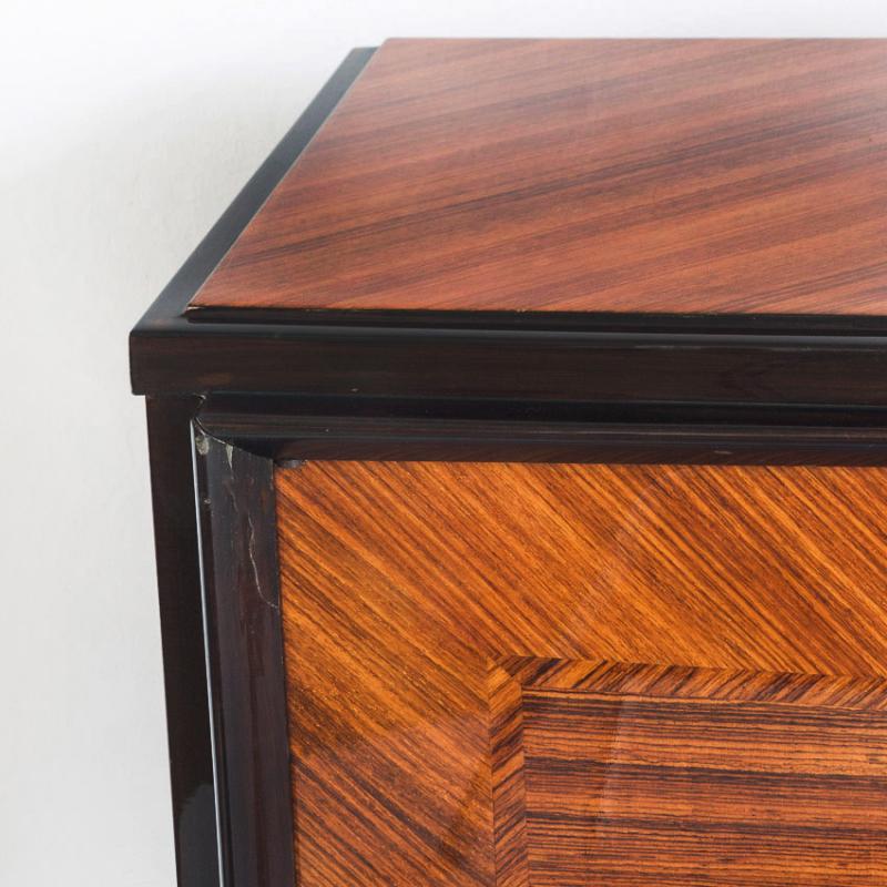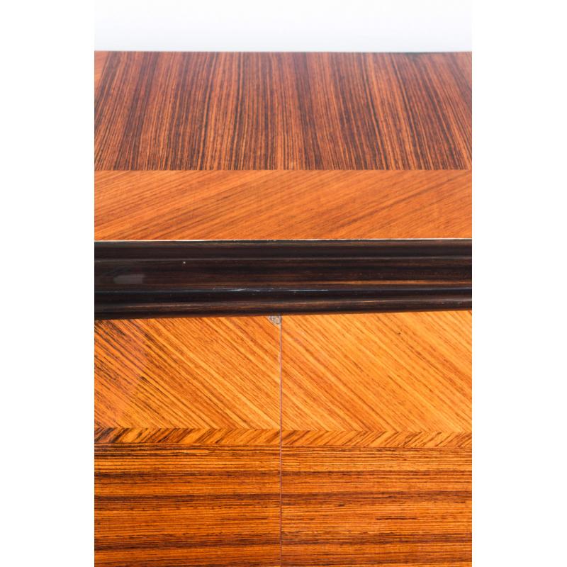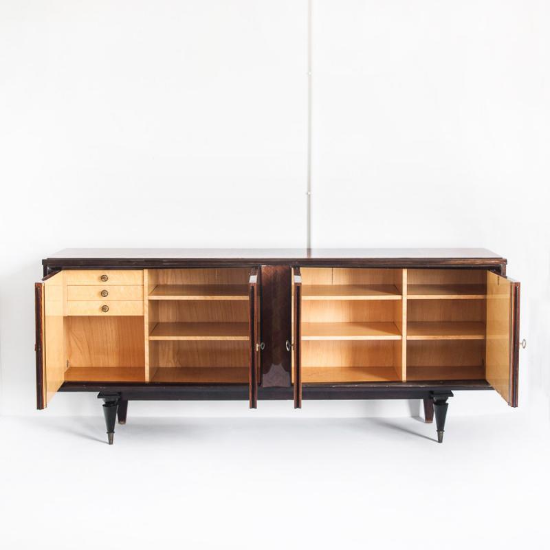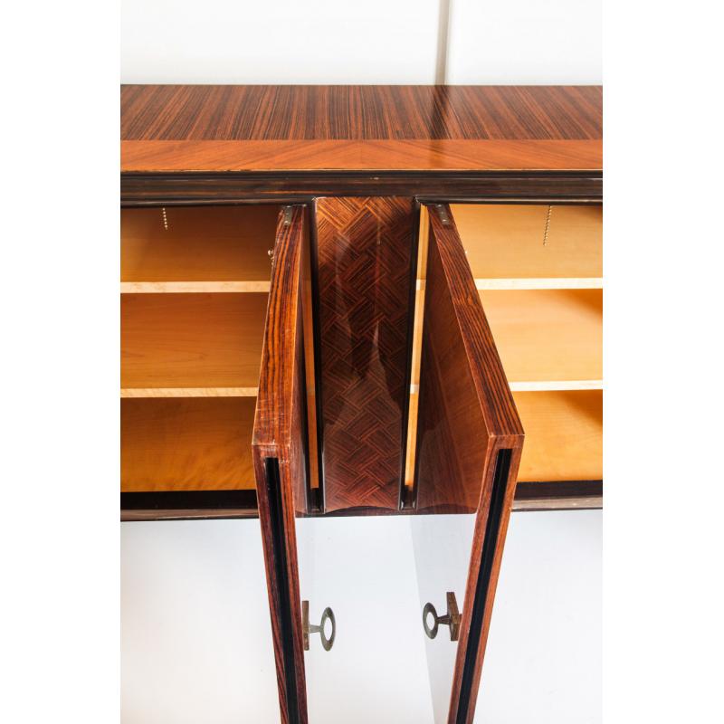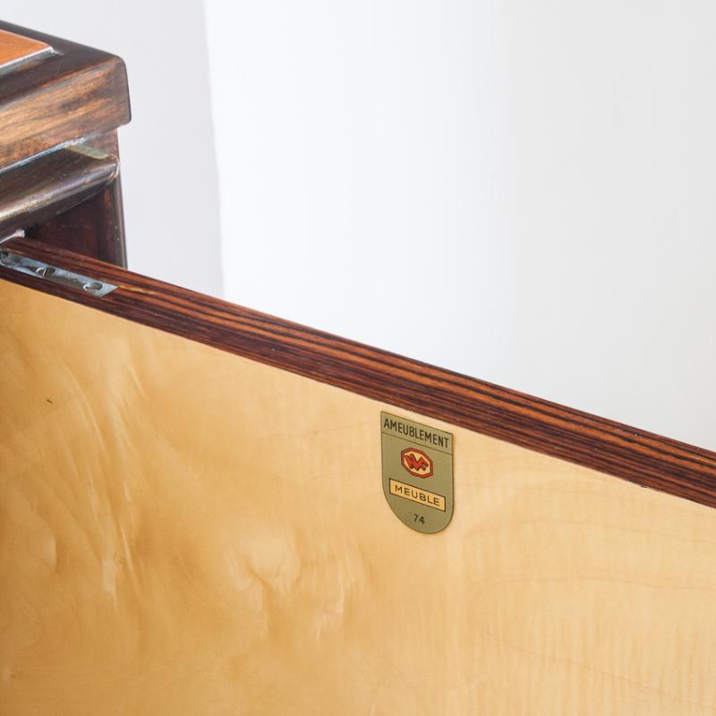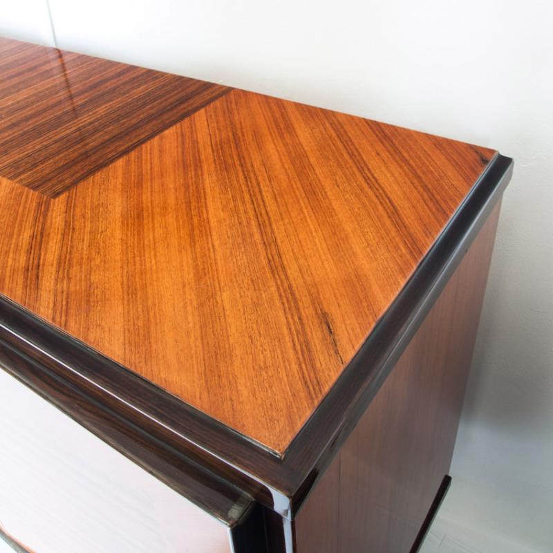 Interior con múltiples estantes y tres cajones. Acabado con barniz de poliester de alta resistencia y durabiliad. Leves signos de uso.