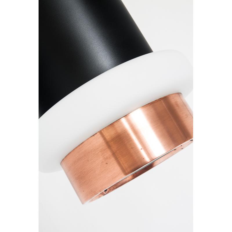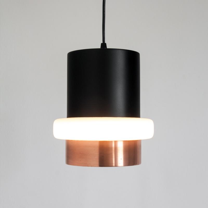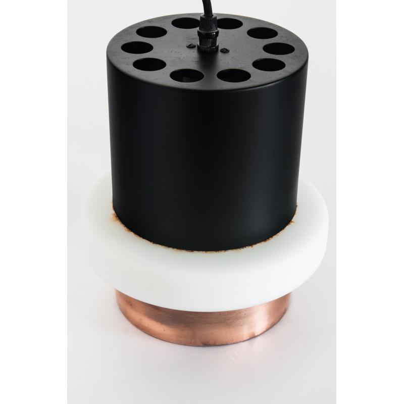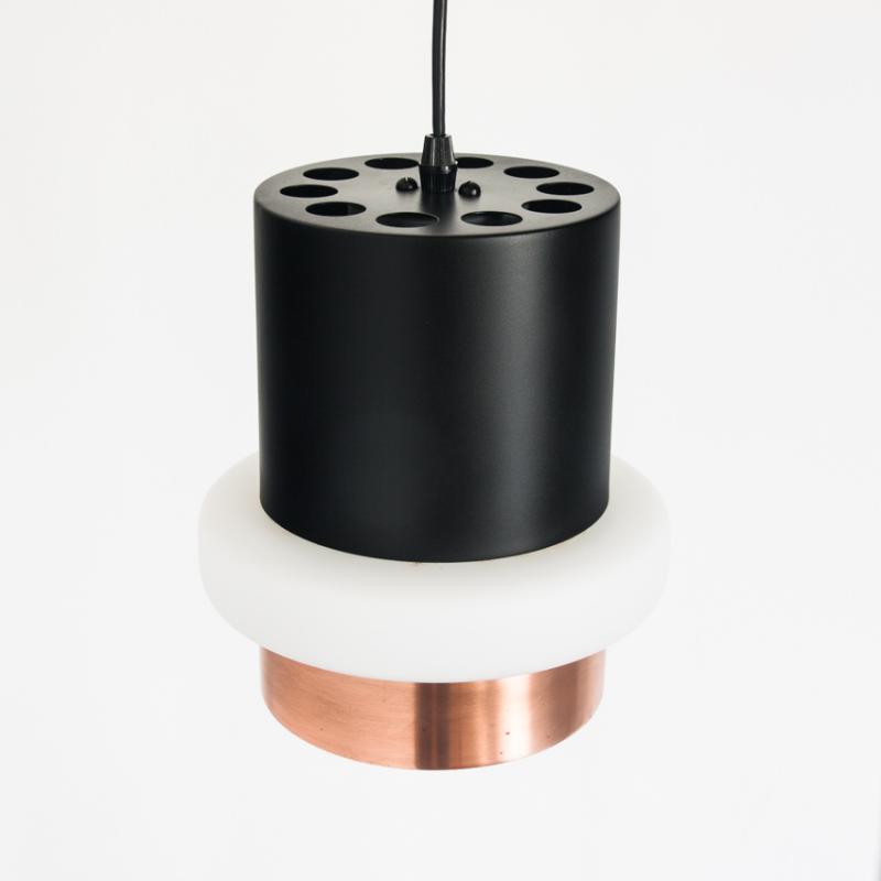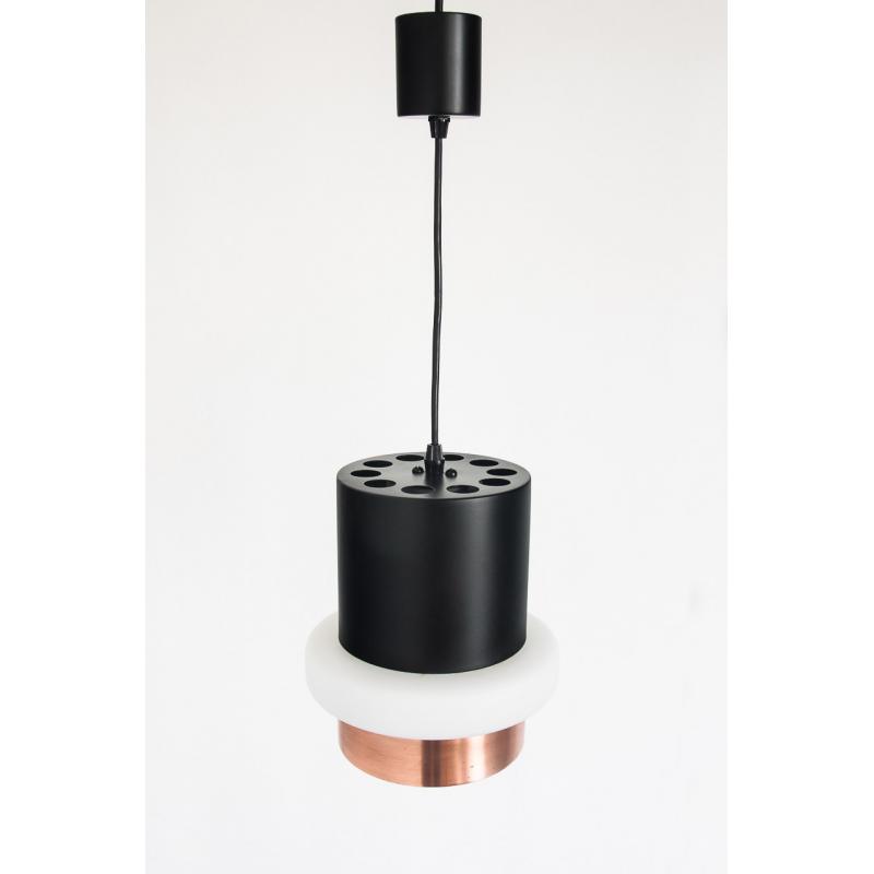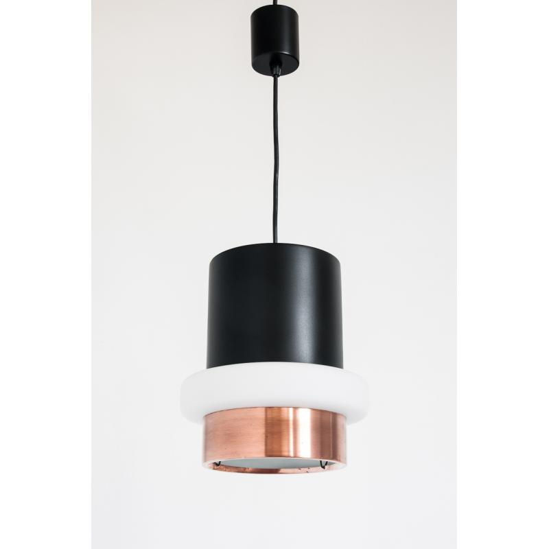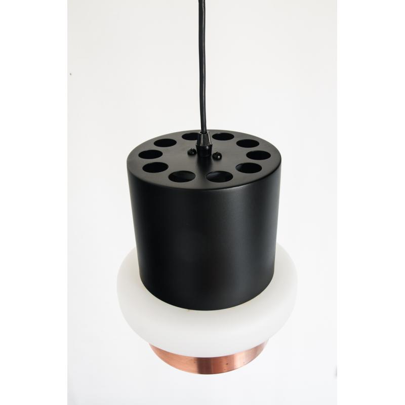 Cilindro principal en metal lacado negro, opalina de cristal blanco y cilindro inferior de cobre pulido. Cableado original en buen estado. Utilizan bombillas de tipo B22 (existen adaptadores para rosca E27 o E14).