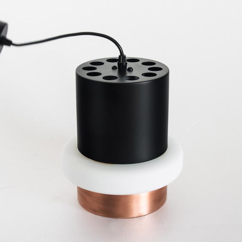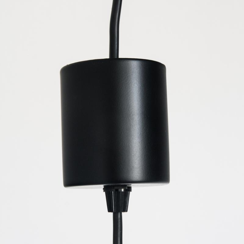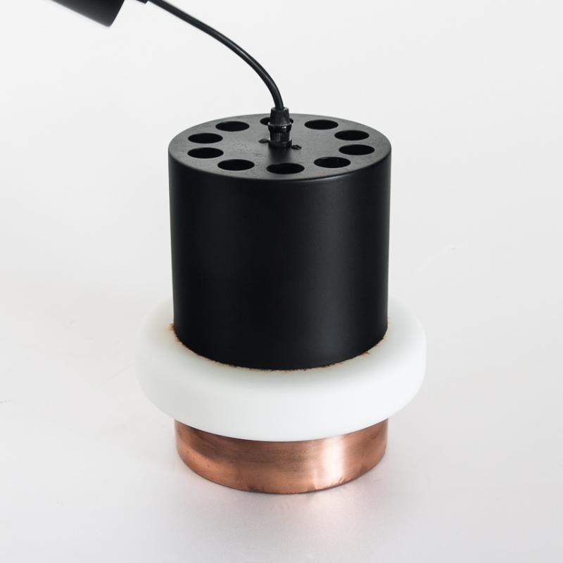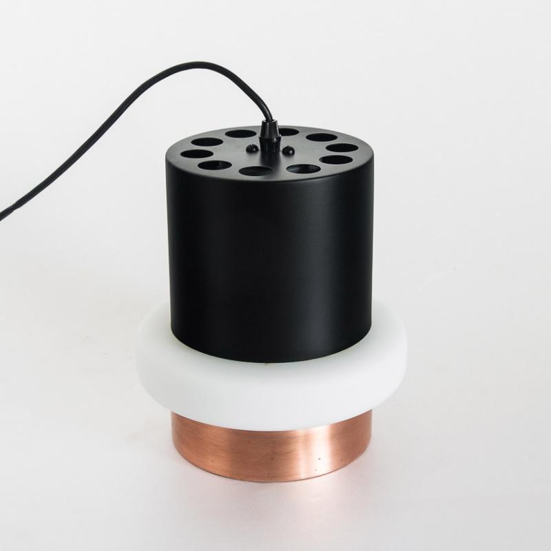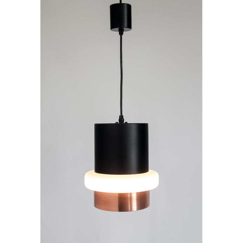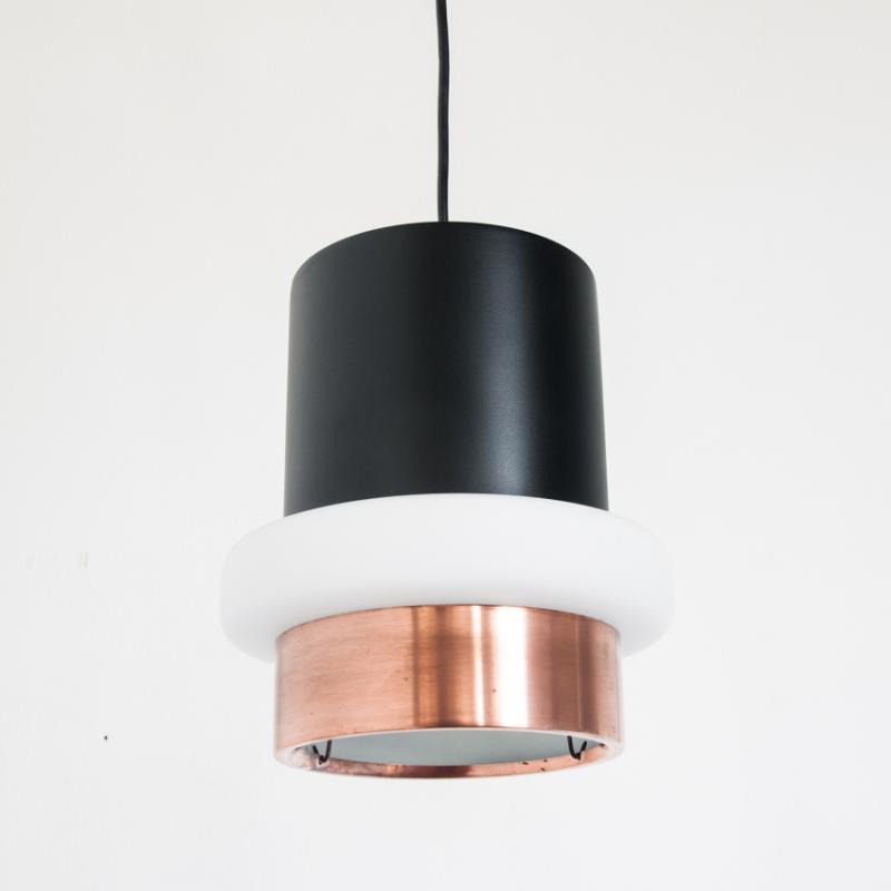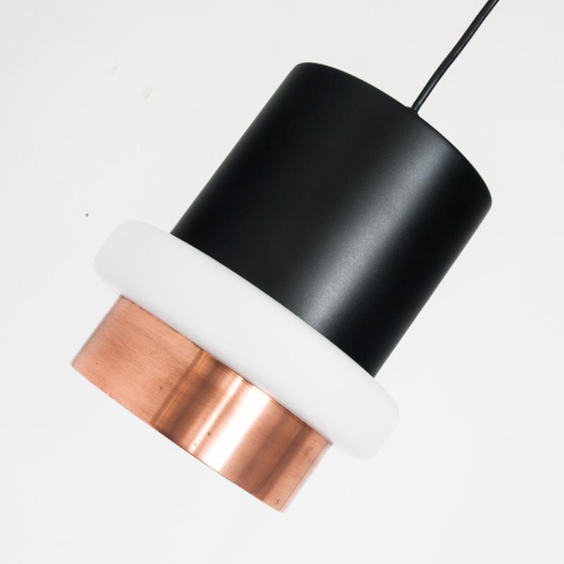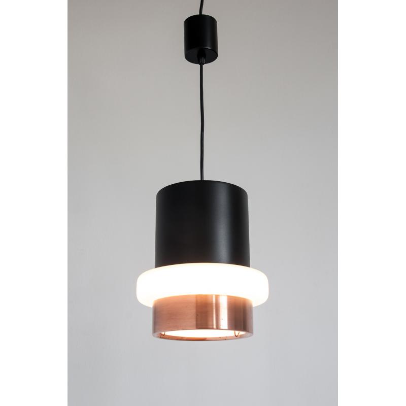 Cilindro principal en metal lacado negro, opalina de cristal blanco y cilindro inferior de cobre pulido. Cableado original en buen estado. Utilizan bombillas de tipo B22 (existen adaptadores para rosca E27 o E14).