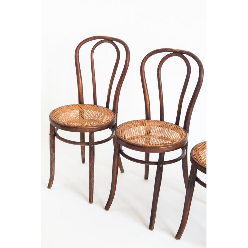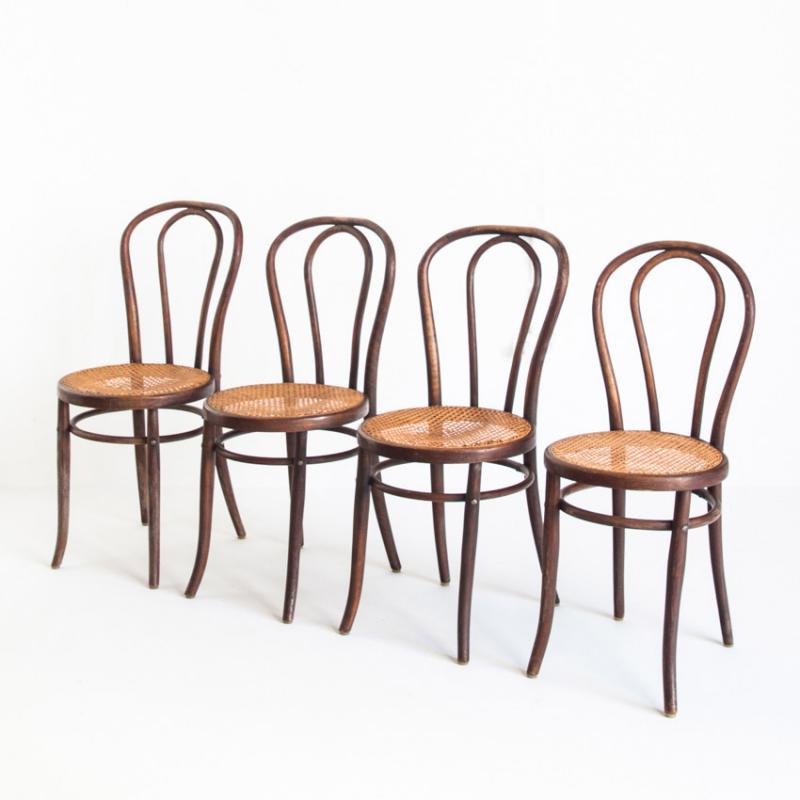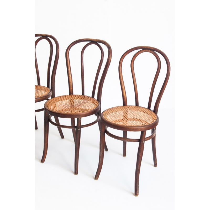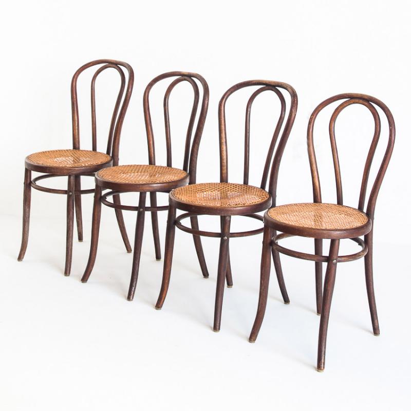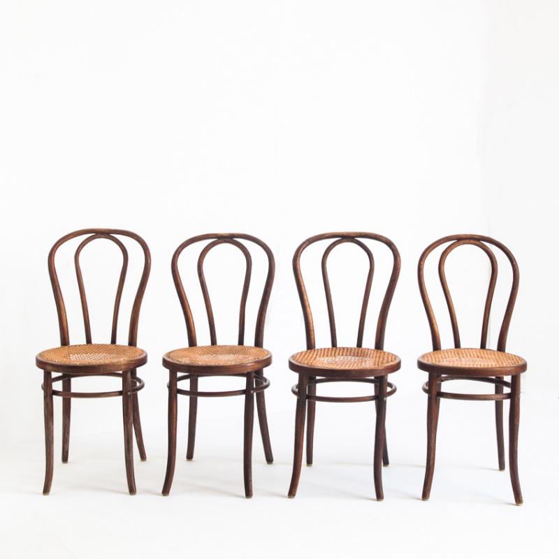 Conjunto de 4 sillas estilo Thonet. Madera curvada y rejilla. Vintage. Francia, años 50.